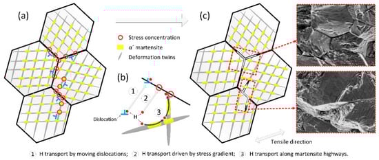 (2) Hydrogen accumulation. Clearly, stress concentration at grain or twin boundaries can induce hydrogen accumulation due to stress-assisted hydrogen diffusion [], Figure 12b②. Moreover, since dislocations are trapping sites for diffusible hydrogen (grain boundaries are also trap sites), hydrogen can be transported to grain or twin boundaries by moving dislocations [], Figure 12b①. Figure 4 has indicated that more dislocations present at the vicinity of grain boundaries and twin boundaries. Furthermore, hydrogen can also be transported to these boundaries and their intersections through α′ “highways” for hydrogen diffusion, Figure 12b③. Thus, hydrogen can accumulate on grain or twin boundaries and their intersections. Under the combined action of stress concentration and concentrated diffusible hydrogen, IG fracture initiates at the intersections of grain–grain/grain–twin boundaries and crack propagation occurs along grain or twin boundaries, because the cohesive energy of these intersections and boundaries is reduced by hydrogen, Figure 12c.