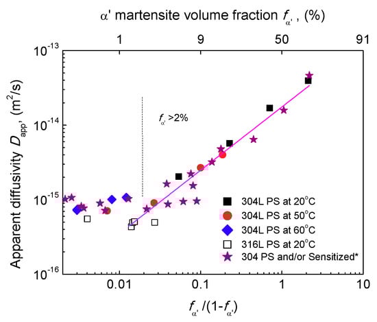 Figure 11d depicts the apparent solubility calculated by Equation (6), although total hydrogen amount into a specimen increases with increasing α′ fraction, the decreases rapidly with α′. This is because the solubility of hydrogen is much lower in α′ than in γ. This also indicates that the hydrogen charged into was mainly stored inside γ phase. Evidently, there is a competition between the reduction of solubility (hydrogen concentration dissolved at surface) and the increase of apparent diffusivity due to α′. In fact, Figure 11c shows that initially rapidly increases with increasing prestrain, but later becomes not much changed with further increasing prestrain, because of the competition.