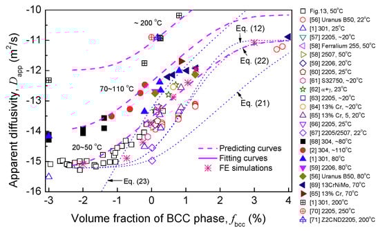 where and are diffusivities of BCC and FCC phase, respectively. Table 2 gives a summary of hydrogen transport parameters reported for BCC and FCC phase [,,,,]. Since is 5–6 orders of magnitude higher than , but is 2–3 orders of magnitude lower than , we can expect that for a duplex material, in which BCC phase is rich. Thus, for the parallel configuration, the last items of Equation (10) is ignored, Equation (10) becomes