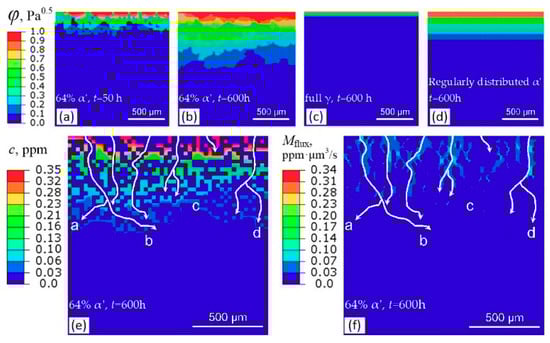 Contour results obtained by ABAQUS. (a–d) Normalized hydrogen concentration, φ; (e) hydrogen concentration, c; (f) magnitude of the concentration flux vector of hydrogen, Mflux. The white lines with arrows in (e,f) represent the hydrogen diffusion path. The locations, where α′ squares connect with each other to form a path, i.e., (a–d), show the role of α′ as diffusion “highways”.