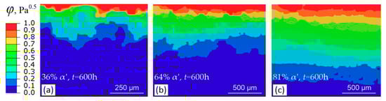 Figure 16 and Figure 17 show the contour results obtained by ABAQUS. Hydrogen transport depth increases with time, Figure 16a,b. The presence of α′ platelets significantly accelerates the hydrogen transport, as indicated by Figure 16b,c. If the α′ squares connect with each other into a path along depth direction, the acceleration is more significant, as indicated by location a, b, and c in Figure 16e, where diffusion “highways” can be traced out along the connected α′ squares and the transport path is crooked. The magnitude of concentration flux vector of hydrogen, Mflux, is very large along the connected α′ squares, Figure 16f, demonstrating directly the “highways” role of connected α′ platelets in hydrogen transport. However, if the α′ squares are surrounded by γ platelets, the transport rate is somewhat small, as indicated by location e in Figure 16e. Figure 16d shows the result of a case where all α′ squares are surrounded by γ phase, similar with the cases considered by Olden et al. [], where the α′ squares are all embedded in γ phase and are arranged regularly rather than randomly. Evidently, this case results in a lower transport depth. Thus, it may be not suitable for a duplex material with irregularly distributed embedded platelets, such as the prestrained and α′-containing 304L steel. Moreover, at the same time, hydrogen transport depth increases with volume fraction of α′, Figure 17.