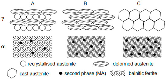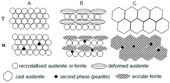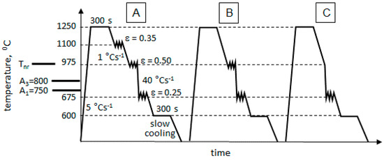 Schemes of processing schedules investigated: (A) with two deformations, (B) one deformation, or (C) no deformation in austenite temperature region.