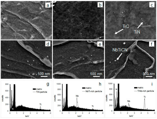 SEM images of precipitates in (a–c) Ti-steel and (d–f) MoNbTi-steel, after processing according to schedule (a,d) A, (b,e) B and (c,f) C (Figure 1) and EDS spectra of (g) TiN particle in the Ti-steel, (h) NbTi-rich particle in the MoNbTi-steel and (i) TiNb-rich particle in the MoNbTi-steel.