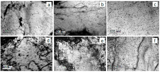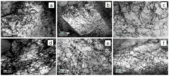 TEM images of typical dislocation structure in (a–c) Ti-steel and (d–f) MoNbTi-steel, after processing according to schedule (a,d) A, (b,e) B and (c,f) C (see Figure 1).