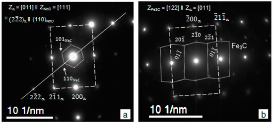 SEM imaging has shown the presence of 20–70 nm precipitates in the Ti-steel and 20–140 nm ones in the MoNbTi-steel (Figure 6a–f). EDS analysis has proven the particles to be of TiN and TiC type in the Ti-steel (Figure 6g) and NbTiCN and NbC type in the MoNbTi-steel (Figure 6h,i). The relative amount of Ti and Nb in the NbTiCN particles is believed to vary, as the Ti and Nb energy peaks on EDS spectra were of different height (compare Figure 6h,i). TEM imaging revealed presence of 2–20 nm particles in both steels in all processing conditions (Figure 7). Due to their small sizes, the EDS analysis of particles was unsuccessful. Thus, their type was identified using selected area diffraction and measurement of unit cell sizes. This approach has shown the 2–20 nm particles to be TiC and Fe3C in the Ti-steel, and NbC and Fe3C in the MoNbTi-steel. Selected examples of the diffraction analysis are presented in Figure 8. The TiC lattice parameter was measured to be a = 0.433–0.436 nm, which is in good agreement with the previously reported value of 0.432–0.433 [62,63]. The measured NbC lattice parameter of a = 0.446 nm was also in the range of previously reported values of 0.436–0.450 nm [64,65,66]. TiC and NbC particles (in the Ti- and MoNbTi-steels, respectively) exhibited [011]matrix || [111]carbide and ()matrix || (110)carbide orientation relationship with the matrix (Figure 8a), which is a variant of Kurdjumov–Sachs orientation relationship [67]. This indicates that TiC and NbC particles precipitated in austenite. A diffraction pattern showing the [122]Fe3C || [011]matrix orientation relationship in Figure 8b originated from the orthorhombic crystal lattice, characteristic for Fe3C particles [68,69]; and the measured spacing of 0.269 nm was in good agreement with nm calculated based on the Fe3C lattice parameters a = 0.674 nm, b = 0.453 nm and c = 0.509 nm [70].
