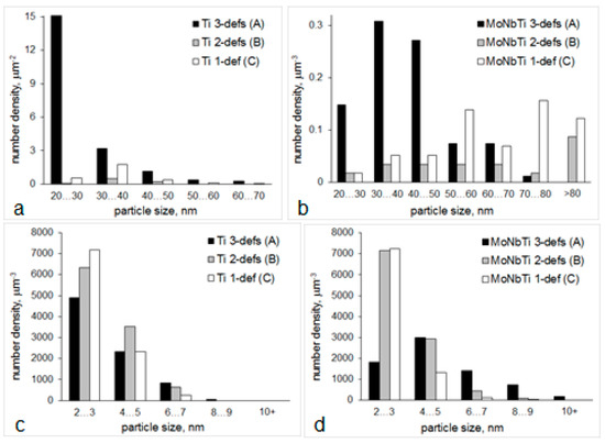 - With elimination of deformation at 1100 °C (route B), the >20 nm particle number density decreased by almost 30 times (note the particle size distribution variation in Figure 9a), the average particle size increased, relative amount of >20 nm TiC particles decreased to 25% (from 41% for route A), the <20 nm particle number density increased by 1.3 times (note the particle size distribution variation in Figure 9c), amongst <20 nm particles the TiC ones were identified in addition to Fe3C, the matrix unit cell size increased to 0.305 nm (from 0.296 nm for route A). These suggest a substantial decrease in strain-induced precipitation in austenite, compared to route A, with more Ti and C available for precipitation of <20 nm particles.