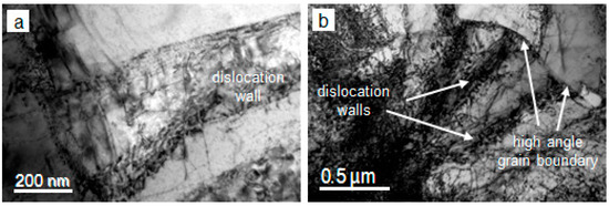 Dislocation walls in (a) Ti-steel and (b) MoNbTi-steel.