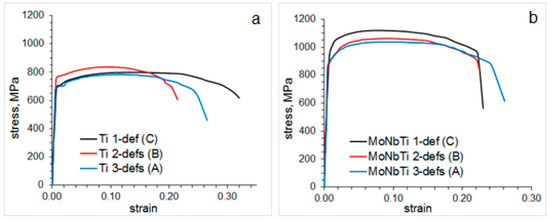 Ambient temperature stress-strain curves for (a) Ti-steel and (b) MoNbTi-steel.
