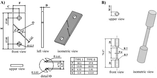 Geometry of the used specimens: (A) shear, ASTM B831-05 type I and type II; (B) tensile, UNI EN ISO 6892-1.