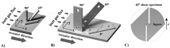 Tensile and shear specimens were built in different orientations relative to the LPBF process. Figure 3 shows the build orientations of samples parallel to the layers (0°), parallel to the growth direction (90°), and inclined at 45° with respect to both previous directions (45°). In the case of 45° shear specimens, specific attention has been paid to test interlayer shear strength; the geometry and orientation of the specimens allowed for the application of the shear loads on a surface which is parallel to the powder bed (Figure 3). Figure 3 also shows the direction along which the recoater blade spreads the powder in the bed, and the direction of the inert gas flux on the powder bed. The latter is very important in order to blow the melting slags away from the build area.