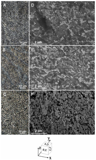 OM (A–C) and FEG-SEM (D–F) images of etched sections parallel to: the XY plane (A,D); the XZ plane (B,E) and the YZ plane (C,F).