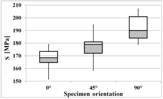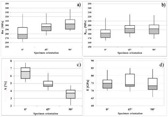 Anisotropy of mechanical performance, i.e., possible significant differences in the values that have been measured for the three orientations, was evaluated by statistical tools (Statistica 8, Statsoft, Hamburg, Germany). A correlation analysis was done of the independent variable ‘orientation’ on all the measured mechanical characteristics listed in Table 4. Table 7 registers the results, expressed in terms of correlation coefficients and probability values (p-values). When lower than 0.05, the p-values can be taken as a decision to reject the null hypothesis of insignificance of the correlation. A significant, even if slight, effect of orientation onto tensile and shear strength was observed. The same applies to total extension at break, but in this case a much greater variation was measured: ductility was nearly halved from 0° to 90°. For elastic modulus and yield strength, instead, the variations are within the scattering of experimental data, since the associated p-values are much higher than 0.05. As anticipated above, the same is true for shear strength of specimens produced with the two different thickness values (Types I and II): no differences are observed.