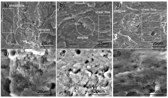 SEM observations of the rupture surface of A357.0 shear test specimens. The failure morphology changes with the growth direction of the specimen: (a,d) 0°, (b,e) 45°, and (c,f) 90°.