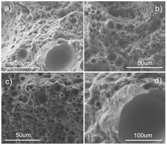 Other authors previously observed a mixed quasi-cleavage and dimpled morphology on the fracture surfaces of A356 tensile samples, in the as-cast condition or after T6, as well as of A357 produced by LPBF [18,19]. Jiang Wen-Ming et al., found that the dimpled morphology is dispersed uniformly under the T6 condition, compared to the as-cast condition.