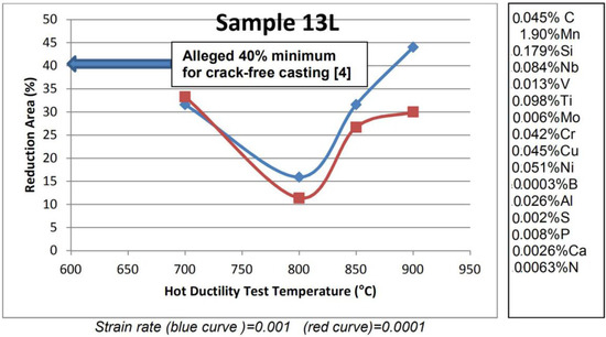 The traditional %RA data was generated for all of the industrial samples. Figure 3 illustrates the traditional hot ductility test measure of % reduction in area for a low carbon microalloyed plate steel at 800 °C.