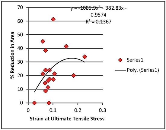 Percent reduction in area versus strain at ultimate tensile strength [15].