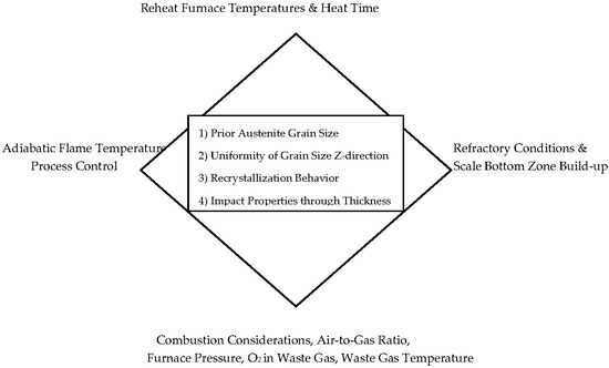 This reheating step in the steelmaking process often receives low priority in the evaluation of product quality and mechanical property performance, especially the toughness through the plate thickness. Heat transfer conditions of radiation, convection, and conduction affect furnace heating efficiency. In laboratory studies, the furnace heating step is typically quite uniform, resulting in a homogeneous and fine prior austenite grain size. During production, it is much more difficult to control the uniformity of heating and heat transfer consistently along the entire length and through the thickness of the work piece. The furnace conditions are correlated to product quality via furnace process variables, such as the air to gas ratio, furnace burner condition, furnace pressure, energy efficiency, adiabatic flame temperature (AFT), and furnace refractory condition.