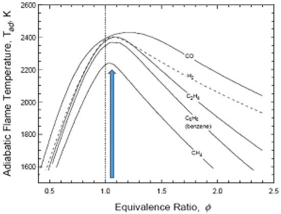 Adiabatic flame temperature and air-to-gas equivalence ratio [17].