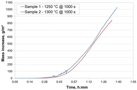 Increase in mass over time for oxidation at 1250 °C and 1300 °C in methane combustion atmosphere (reproduced from [19], with permission from the authors, 2014).
