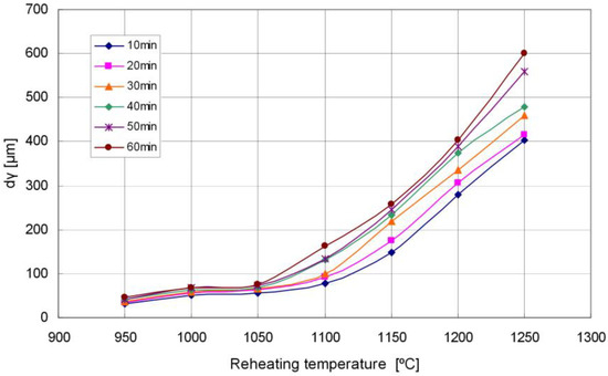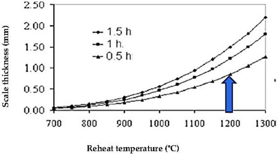 It is apparent from Figure 10 at 1200 °C that an increase in hold time from 1.00 to 1.50 h will increase the scale thickness by nearly 30%. Scale behaves as an insulator, and consequently, the thicker the scale then a reduction in the thermal conductance of heat absorbed by a given slab. A second factor involves the influence of the air-to-gas ratio. As the air-to-gas ratio increases, the AFT decreases and then due to more oxygen in the furnace environment, the iron oxide scale thickness will increase. Heat conductance requires longer heating times. The scale layer is an insulating layer on the slab surface, reducing the slab heat conduction efficiency. Under these conditions, longer soaking times are necessary to ensure the proper heating of the center of the slab. Longer soak times lead to increased prior austenite grain size. This variation in the heating process will significantly affect the resultant thermal homogeneity and gradient from the surface of the slab to the center of the slab, as well as the austenite grain size and distribution and ensuing recrystallization behavior.