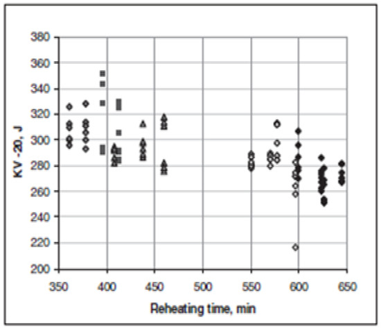 Figure 12 shows the time parameter effect at a low reheat temperature of 1170 °C and the associated deterioration in toughness for slabs held over 500 min. Also, greater than 500 min heating time generally exhibits lower average toughness when compared to the less than 500 min heating time.