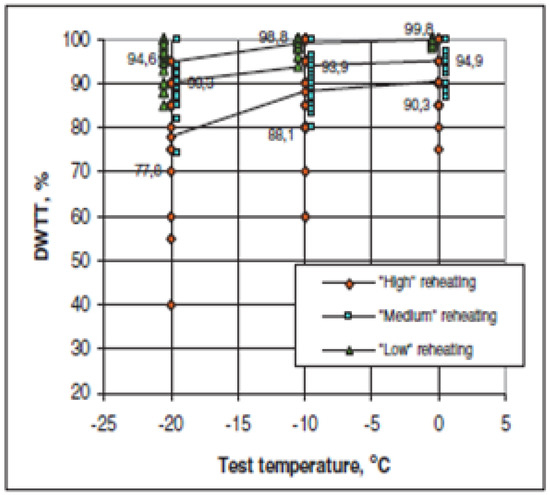 Shear area of drop-weight tear tests (DWTT) versus DWTT test temperature (reproduced from [22], with permission from The Minerals, Metals &Materials Society, 2016).