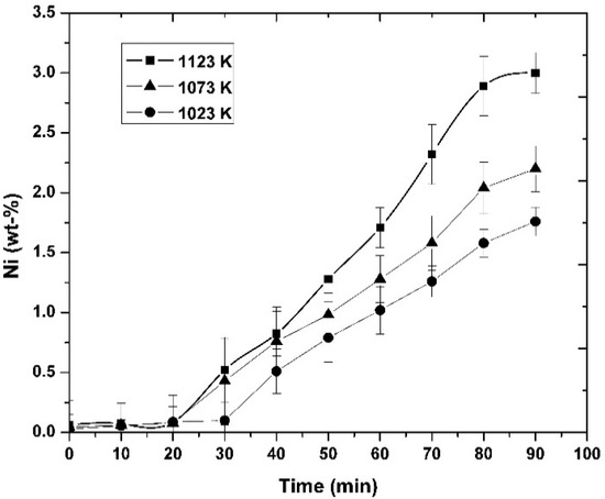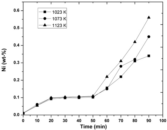 Figure 2 and Figure 3 show that the Ni concentration increased in the molten alloys as a function of the injection time for the temperatures and initial magnesium concentrations indicated, at the agitation speed of 300 rpm. From these graphs, the nickel concentration reached the highest value at higher magnesium concentrations, at the temperature of 1123 K.