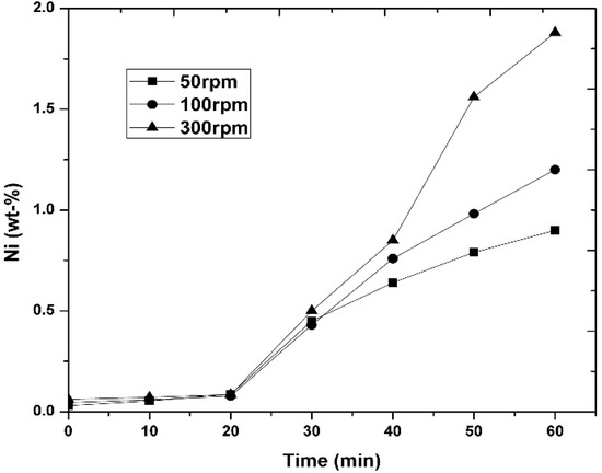 Figure 4 shows the increase in the Ni concentration as a function of the injection time for the agitation speeds considered, at the constant initial Mg concentration and temperature indicated. From this figure, it can be observed how the agitation speed plays an important role in the aluminothermic reduction of the NiO particles, which was due to the improved mass transfer conditions attained at higher values of this parameter. Indirectly, it also indicated the diffusive nature of the process taking place.