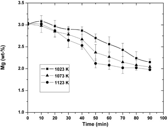 Figure 5 shows the variation in the magnesium concentration as a function of the NiO injection time, and the concentration of magnesium decreased continuously during the injection, reaching the lower value of 1.98 wt-% at the end of the experiments for the given conditions established.