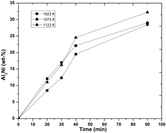 Increase of the Al3Ni intermetallic phase as a function of injection time for the temperatures indicated at the constant agitation speed of 300 rpm.