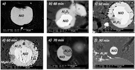The micrographs in Figure 8 show the evolution of the thickness of the layers of the NiO particles reacted as a function of the reaction time, taken from the molten metal at a temperature of 1123 K for an agitation speed of 300 rpm. After 30 min, the particle remained unreacted (Figure 8a), and after 40 min of addition, it began to form an Al2O3 layer around the NiO particle (Figure 8b). This layer grew progressively until the reaction stopped because of a change in the mechanism that controls the reaction (Figure 8c,d). After 70 min of contact (Figure 8e), the Al2O3 layer began to disappear. In the micrographs, it can be seen that after 90 min of reaction, the Al2O3 layer completely disappeared, leaving only the solid particle and the Al3Ni intermetallic particles around them.