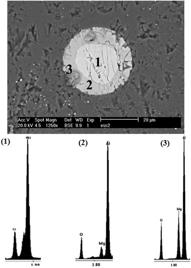The particle shown in Figure 8d was analyzed separately by energy dispersion spectroscopy in the SEM, and the corresponding energy dispersive X-ray spectroscopy (EDS) patterns, together with the micrographs showing the microareas from where they were obtained, are shown in Figure 9. The microanalysis measurements show that the nucleus of NiO was surrounded by an Mg and Al-rich phase, marked as (2) and (3). The semi-quantitative chemical composition of the layer of the reaction product, as shown in Table 5, was observed as the phase formed was spinel (MgAl2O4). These EDS results suggest that the NiO was reduced by aluminum and magnesium, forming intermediate reaction products such as the spinel phase, while the Ni-rich phase corresponded to Al3Ni [26].
