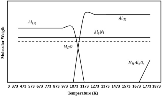 The aluminum alloys obtained in this work contained between 2 to 3 wt-% of both Mg and Ni, therefore, a thermodynamic explanation would help to understand the expected results. During the aluminothermic reduction process, the Al, Mg, and NiO species are involved, and react to obtain different reaction products. The software FactSage allowed us to consider ideal solutions for the Al-Mg-Ni system in the solid and liquid states. The reactants that were introduced into the software were Al, Mg, and Ni as pure species. The balance of the system was computerized for the temperature range from 373 to 1273 K, where the activities considered for Al, Ni, and Mg were equal to 1. Figure 11 shows the results of the software in the Al-Mg-Ni equilibrium system. The phases that were present below the melting temperature of aluminum were Al(s), MgO, and Al3Ni in their stable forms, while at temperatures higher than 933 K, the Al and Mg were in a liquid state. These results define the reactions involved during the reduction of NiO powders by Al-Mg(l). The formation of MgO is thermodynamically feasible from room temperature up to the melting temperature of aluminum. However, the diagram drawn by the software was preliminary as the kinetic conditions change continuously during the reaction.