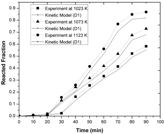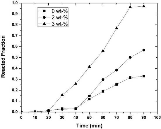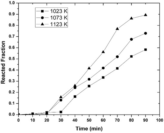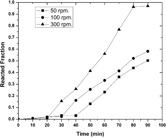 Figure 12, Figure 13 and Figure 14 show the change in the reacted fraction as a function of time, for the different set of parameters studied, resulted from the application of Equation (11) to the experimental results obtained. In general, it can be observed from these graphs that the aluminothermic reduction reaction was not completed for any value of the parameters studied (i.e., temperature, initial magnesium concentration, or agitation speed), owing to the diffusive nature of the reaction, as it will be explained later.