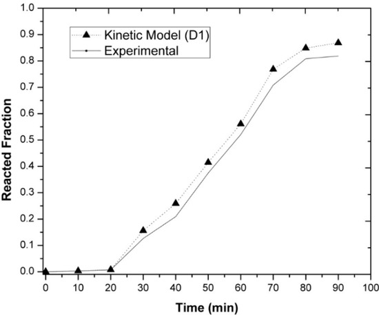 In this sense, it was found that the kinetic information was well suited for the diffusion model equation (D1), as shown in Figure 15, which corresponded to the experiments where alloys with magnesium were used at an agitation speed of 300 rpm. In turn, Figure 16 shows the experimental results at different temperatures. The equation of the model is as follows: