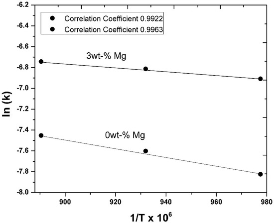 where E is the activation energy (J mol−1), and R is the universal gas constant (8.314 J mol−1 K). Figure 17 shows the linear dependence of a graph of ln (k) against 1/T for the aluminothermic reduction of NiO for alloys with magnesium (a) and without magnesium (b). From the slope values of these graphs, the values of the activation energies were determined as E = 35.75 KJ mol−1 for the alloys without magnesium and E = 15.80 KJ mol−1 for the alloys with an initial magnesium concentration of 3 wt-% Mg.
