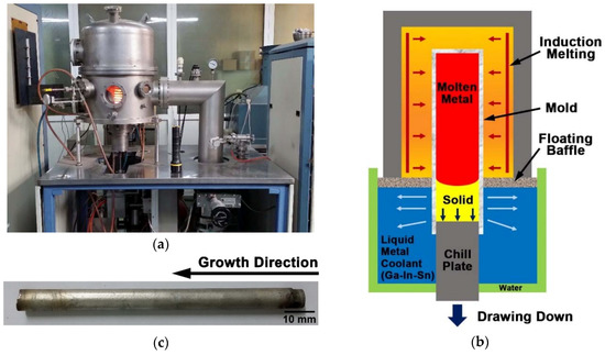 (a) Appearance and (b) schematic illustration of the liquid metal cooling (LMC) type directional solidification apparatus; (c) Optical image of a typical experimental bar after the LMC-DS processing.