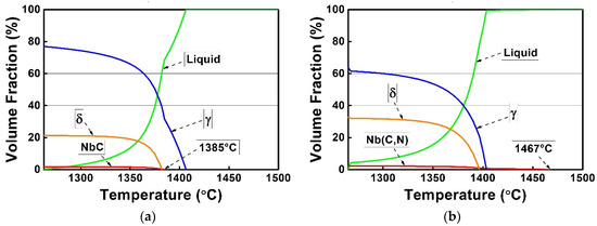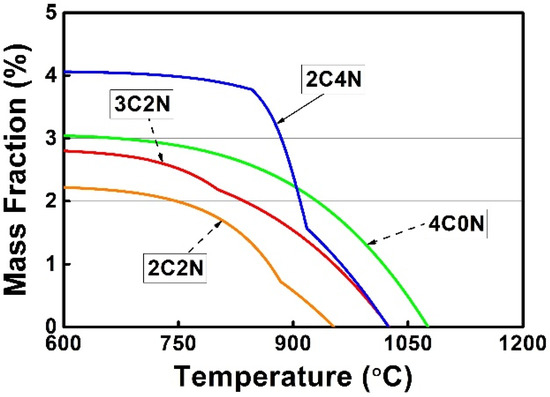 Figure 3 shows the phase diagrams of alloys 4C0N and 2C4N, as a function of temperature under the Scheil-Gulliver condition. It revealed that phases of γ-austenite, NbC/Nb(C,N) carbonitride, and δ-ferrite in these alloys solidified at the expense of the liquid phase as the temperature decreased, without the solidification of (Cr,Fe)23C6 carbide. This carbide, was thus presumed to form during the solid phase transformation process, after the solidification finished. Therefore, the mass fraction of (Cr,Fe)23C6 carbide were calculated under the equilibrium condition and plotted in Figure 4, as a function of temperature. It illustrates that the precipitation temperature of (Cr,Fe)23C6 carbide decreased significantly with the increase of the N/C ratio, except for alloy 2C4N where its precipitation temperature was equivalent to that of alloy 3C2N. The predicted results are listed in descending order for alloys 4C0N, 3C2N, 2C4N, and 2C2N: 1076, 1025, 1024, and 953 °C. The fraction of (Cr,Fe)23C6 carbide showed a similar decreasing trend with increasing the N/C ratio, but the highest phase fraction occurred in alloy 2C4N at lower temperatures.