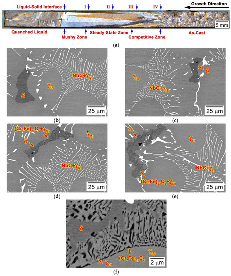 Figure 5b–e are SEM-BSE images taken at typical locations in the steady-state zone and the competitive zone, every 10 mm away from the liquid-solid interface in Figure 5a. These locations were denoted as location I (10 mm), location II (20 mm), location III (30 mm), and location IV (40 mm) with decreasing the temperature. The microstructure at location I, was composed of solidified NbC carbide and δ-ferrite (Figure 5b). This NbC carbide exhibited the typical “Chinese-script” morphology and retained this feature in the as-cast microstructure (Figure 2a). At location II, the residual δ-ferrite had completely solidified and showed the vermicular morphology in the interdendritic regions (Figure 5c). Figure 5d shows the solid phase transformation at location III, where the (Cr,Fe)23C6 carbide precipitated through a typical eutectoid reaction: