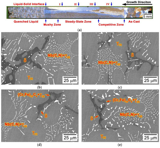 Figure 8b–e are SEM-BSE images taken at typical locations in the steady-state zone and the competitive zone, every 10 mm away from the liquid-solid interface in Figure 8a. These locations were denoted as location I (10 mm), location II (20 mm), location III (30 mm), and location IV (40 mm) with decreasing the temperature. Figure 8b shows that the microstructure at location I, was composed of solidified Nb(C,N) carbonitride and a small amount of residual liquid phase. These Nb(C,N) carbonitrides exhibited the mixed flake-blocky morphologies, whereas the proportion of the blocky ones was significantly higher than that in alloy 2C2N. At location II, none of residual δ-ferrite was observed, neither on the dendritic cores nor in the interdendritic regions (Figure 8c), and this microstructural characteristic was kept at location III and location IV (Figure 8d,e). It should be noted that none of (Cr,Fe)23C6 carbide was observed in the whole steady-state zone and the competitive zone during cooling to room temperature.
