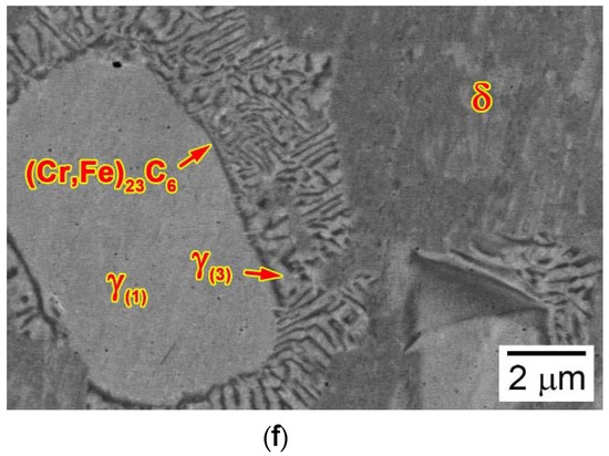Figure 5f is an enlarged SEM-BSE image of typical (Cr,Fe)23C6 carbide and δ-ferrite, acquired from Figure 5d. It reveals that the (Cr,Fe)23C6 carbide occupied the majority of the δ-ferrite colony and showed thicker rods and sheets than that in the as-cast microstructure. The final solid phase transformation occurred at location IV (Figure 5e), whereas it showed similar microstructural characteristics to that at location III.