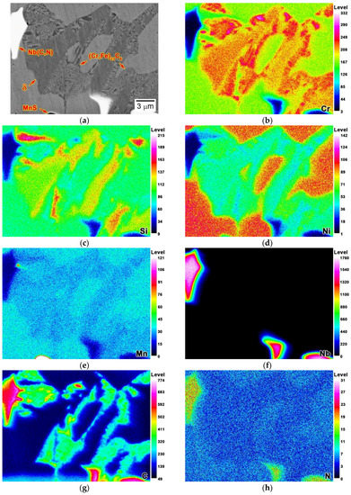 (a) EPMA-BSE image and compositional maps for (b) Cr, (c) Si, (d) Ni, (e) Mn, (f) Nb, (g) C, and (h) N of (Cr,Fe)23C6 carbide and δ-ferrite taken at location III in Figure 6a.