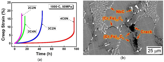 The quantity of the deleterious (Cr,Fe)23C6 carbide in alloys 2C2N and 2C4N had been limited at low levels, but they still exhibited worse creep resistance than alloys 4C0N and 3C2N at 1000 °C (Figure 10a). This is because the NbC/Nb(C,N) carbonitride with the “Chinese-script” morphology, significantly strengthened the grain boundary regions of alloys 4C0N and 3C2N [3]. Therefore, although it was suggested to limit the quantity of (Cr,Fe)23C6 carbide and δ-ferrite through adjusting the N/C ratio, the effect of the N/C ratio on the formation of NbC/Nb(C,N) carbonitride should be considered as well, if optimizing the alloy composition.