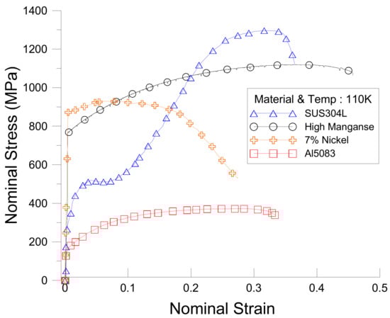 - Kim, S.K.; Lee, C.S.; Kim, J.H.; Kim, M.H.; Lee, J.M. Computational evaluation of resistance of fracture capacity for SUS304L of liquefied natural gas insulation system under cryogenic temperatures using ABAQUS user-defined material subroutine. Mater. Des. 2013, 50, 522–532. [Google Scholar] [CrossRef]
