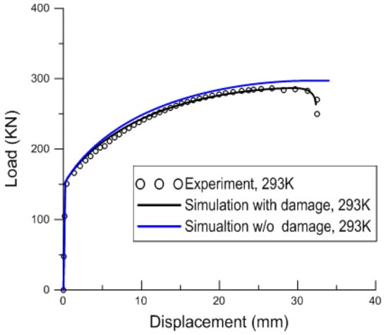 - The modified elastoplastic damage model was coded in FORTRAN through finite element formulation and was embedded with UMAT in Abaqus. The system was simulated under the same conditions as the experimental tensile tests and the results were displayed in a load-displacement graph. The simulation results were compared with the tensile test result and the simulation effectively replicated the nonlinear behavior of high manganese steel.