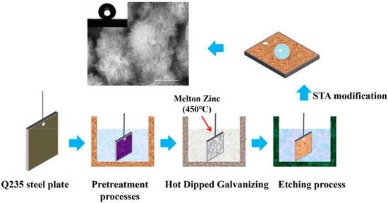 Q235 steel plates specimens, with a size of 3.5 cm × 5 cm × 0.25 cm, were pretreated by degreasing, pickling, fluxing processes to ensure a clean steel surface. Then the steel articles were immersed in a bath of molten zinc (≈450 °C; zinc ≥ 99.995%). The as-fabricated galvanized steel samples were ultrasonically degreased with acetone and ethanol for 10 min respectively. Then the specimens were rinsed with deionized water three times. After that, the galvanized steel samples were immersed vertically in a 50 mL cupric hydrate solution (with Cu2+ concentration ranging from 0.05 M to 0.2 M) for different time at ambient temperature. Hereafter, the immersed substrates were rinsed with deionized water to remove the residual salts and dried under a stream of hot air. Finally, the samples were immersed in a 0.05 M stearic acid (STA, with low surface energy of about 30.03 mJ/m2 [41]) ethanol solution for different time, rinsed with anhydrous ethanol, and then dried under a heat airflow at a temperature about 80 °C for 10–20 s. The schematic fabrication process is shown in Figure 1. For ease of understanding, Table 1 shows the details of each sample prepared.