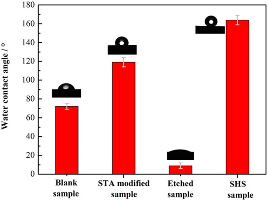 The appearance of N and parts of O may ascribe to the residual from the solution. Since the basic substrate is steel, the element Fe can be ascribe to the steel substrate. The increase of oxygen content suggests that more oxygen is brought into the etched sample surface, and might generate metal oxides [42]. Furthermore, a large amount of Zn element is detected on the deposited particles, which demonstrate that the Zn2+ not completely enter into the solution but remains at the reaction interface. The super-hydrophobic sample surface consists of C, O, Zn, Cu, and Fe, as shown in Figure 5c. The new peak due to C (51.73%) appeared in Figure 5c, while the N element disappeared and the content of Zn, Cu, and O decreased significantly. These variations indicate that the STA is grafted on the surface of the etched sample, which has a significant impact to its wettability.