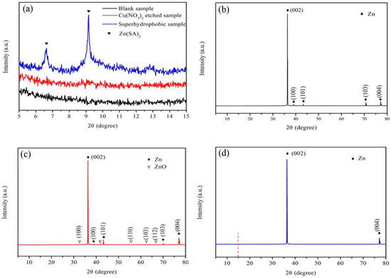 The X-ray diffraction (XRD) was carried out to further determine the phase structure of the super-hydrophobic film on galvanized steel. Figure 6 illustrates the X-ray diffraction and results of the prepared samples. The low angle X-ray diffraction (Figure 6a) results demonstrates that two distinct peaks at 6.57°, 9.15° was observed on the superhydrophobic sample surface, which corresponds to Zinc stearate (Zn[CH3 (CH2)16 COO]2, abbreviated as Zn(SA)2). It should be noted that no characteristic peaks has been found on the blank sample and etched sample surfaces. Meanwhile, some weak peaks that corresponds to ZnO were detected on the etched sample, demonstrating the oxidation of Zinc. Besides, some characteristic peaks at 36.3°, 39.2°, 43.5°, 70.8° in Figure 6b,c and 77.1° in Figure 6d, respectively, which are in good agreement with the characteristic peaks of Zn(002), (100), (101), (103), and (004). This arises from the galvanized zinc layer.