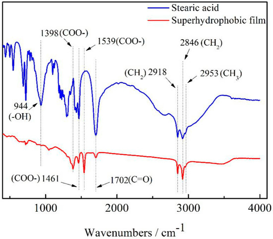 FTIR spectra was employed to study the functional group of the as-prepared superhydrophobic film. Figure 7 shows the FTIR spectra results of stearic acid and the compound scratched from the superhydrophobic film, respectively. It can be seen that the characteristic peaks related to alkyl chain, such as asymmetric vibrations of -CH3(2953 cm−1), asymmetric and symmetric vibrations of -CH2 (2846 cm−1, 2918 cm−1) can be found in the high frequency region of both stearic acid and superhydrophobic film [26]. It is well known that the carboxyl group (COO-) from stearic acid appears at 1702 cm−1. However, it was nearly disappeared in the superhydrophobic sample surface. Compared with the FTIR spectrum of stearic acid, the superhydrophobic film exhibit some newly formed adsorption peaks at 1539 cm−1, 1461 cm−1, and 1398 cm−1, which correspond to asymmetric and symmetric stretches of COO- group [43]. Thus based on the FTIR analysis, we can deduce that the stearic acid is not physically absorbed on the film, but instead reacts chemically with the particles on the surface of galvanized steel, and Zn stearate (Zn[CH3 (CH2)16 COO]2) with low surface energy is most likely formed on the superhydrophobic surface.