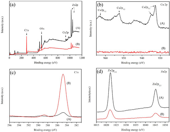 XPS spectra of (A) Cu coated sample and (B) super-hydrophobic sample: (a) survey region; (b) Cu2p; (c) C1s; (d) Zn2p.